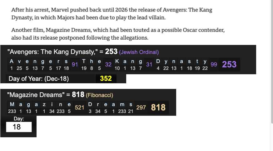 'Avengers: The Kang Dynasty' sums to 253, which is 352